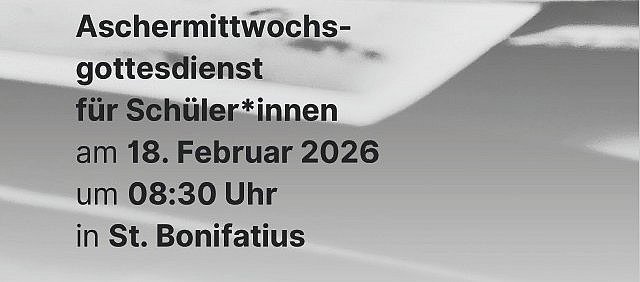 Der Gottesdienst findet am 18.02.2026 um 8:30 Uhr in der Kirche St. Bonifatius (Luisenstrasse 27, 65185 Wiesbaden) statt. Die Schülerinnen und Schüler sollten zur 3. Unterrichtsstunde wieder an der Schule sein.